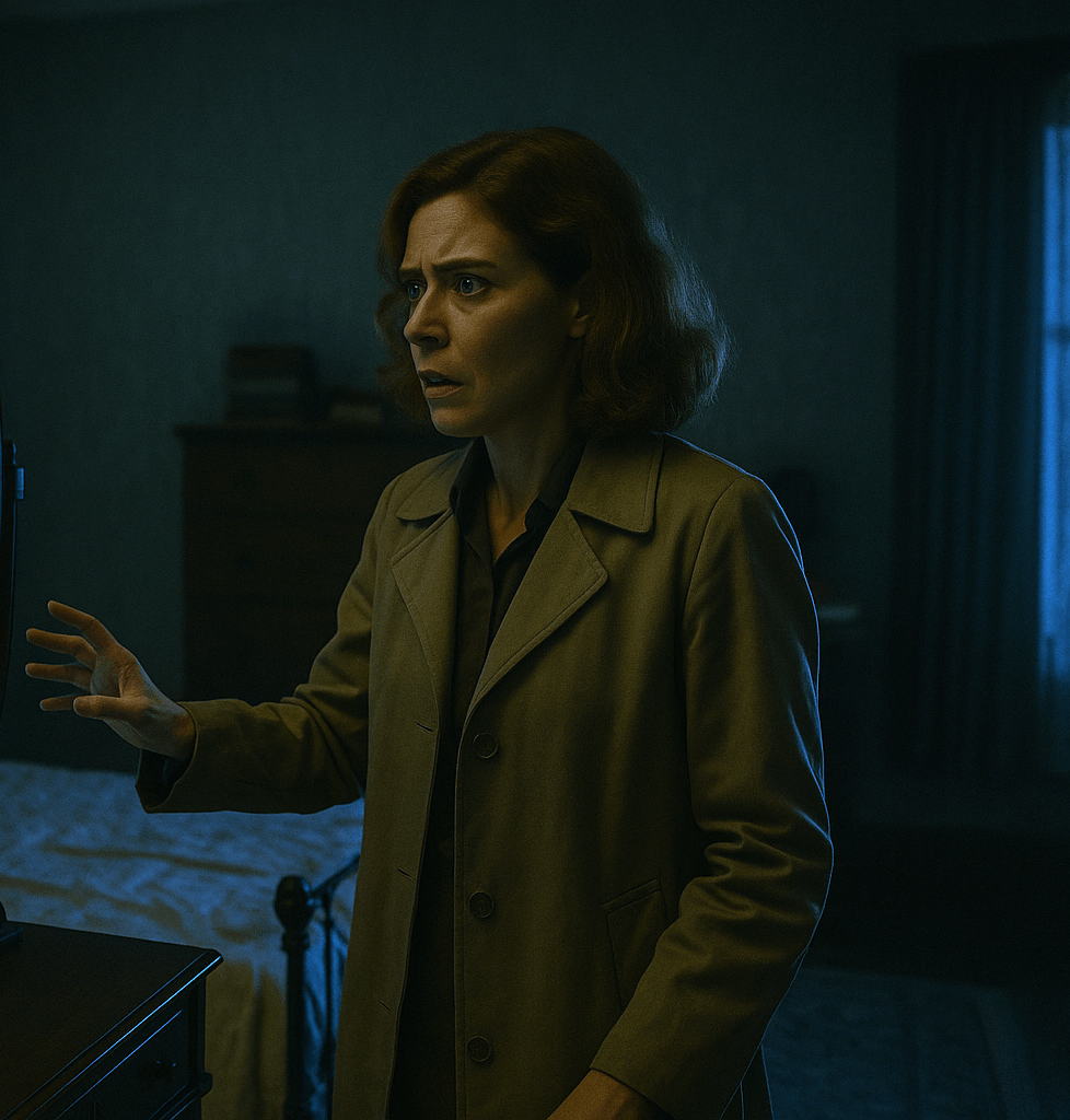 Janet breathes heavily with fear as she follows the footsteps with her eyes – judging the movement of the person in the hallway.