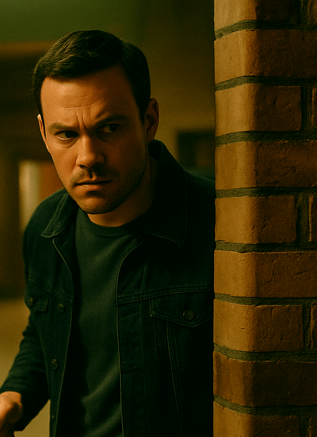 Thug 2 can be seen walking towards one of the stage wings as Stuart waits to emerge from the other. Thug 2 hides in a corner for the moment when his walkie-talkie crackles. Thug 2 looks shocked as he attempts to hide even further and mask the noise of the walkie-talkie.