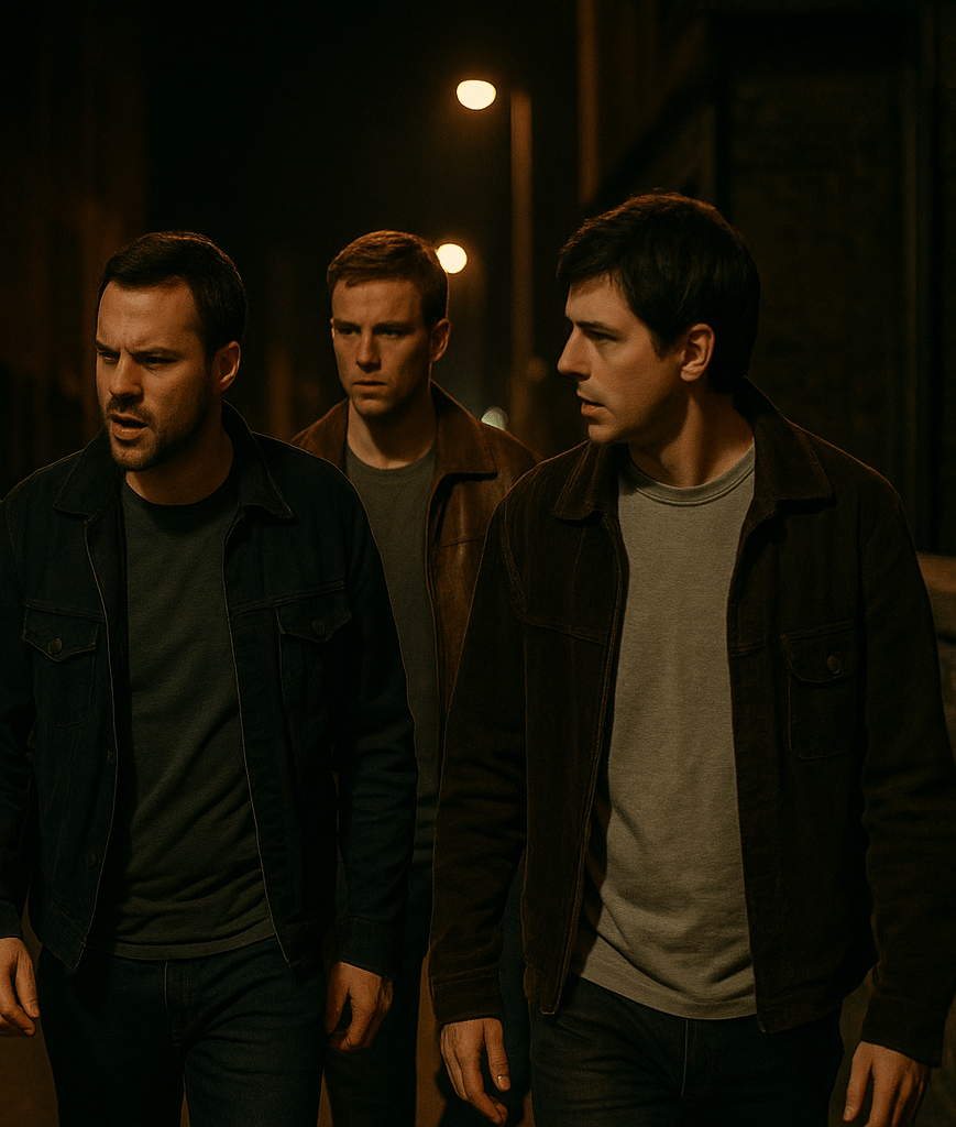 Thug 1 leaps forward to grab Chris but Richard and Stuart intervene just as things are getting out of hand.