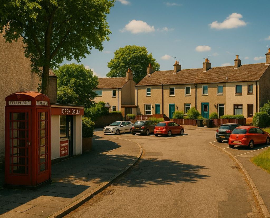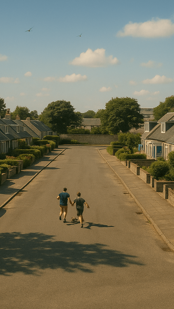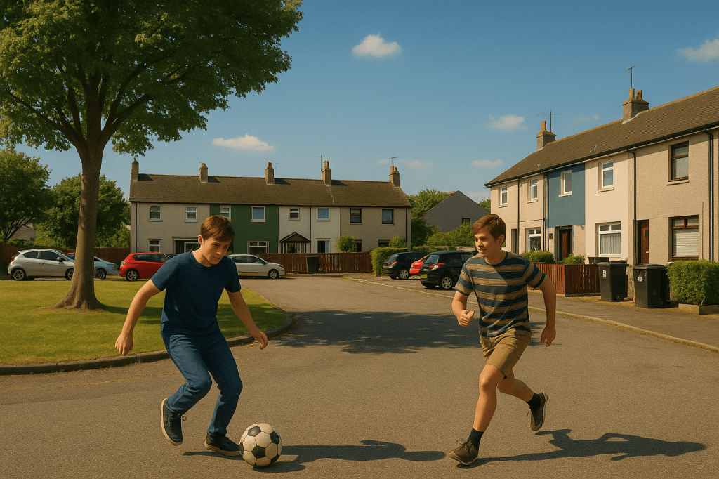 Two teenage children come into view – they are scampering through the car park whilst kicking a football to each other. Their sense of freedom and excitement is apparent as they kick the ball from the kerb and continue running towards the grass play area: