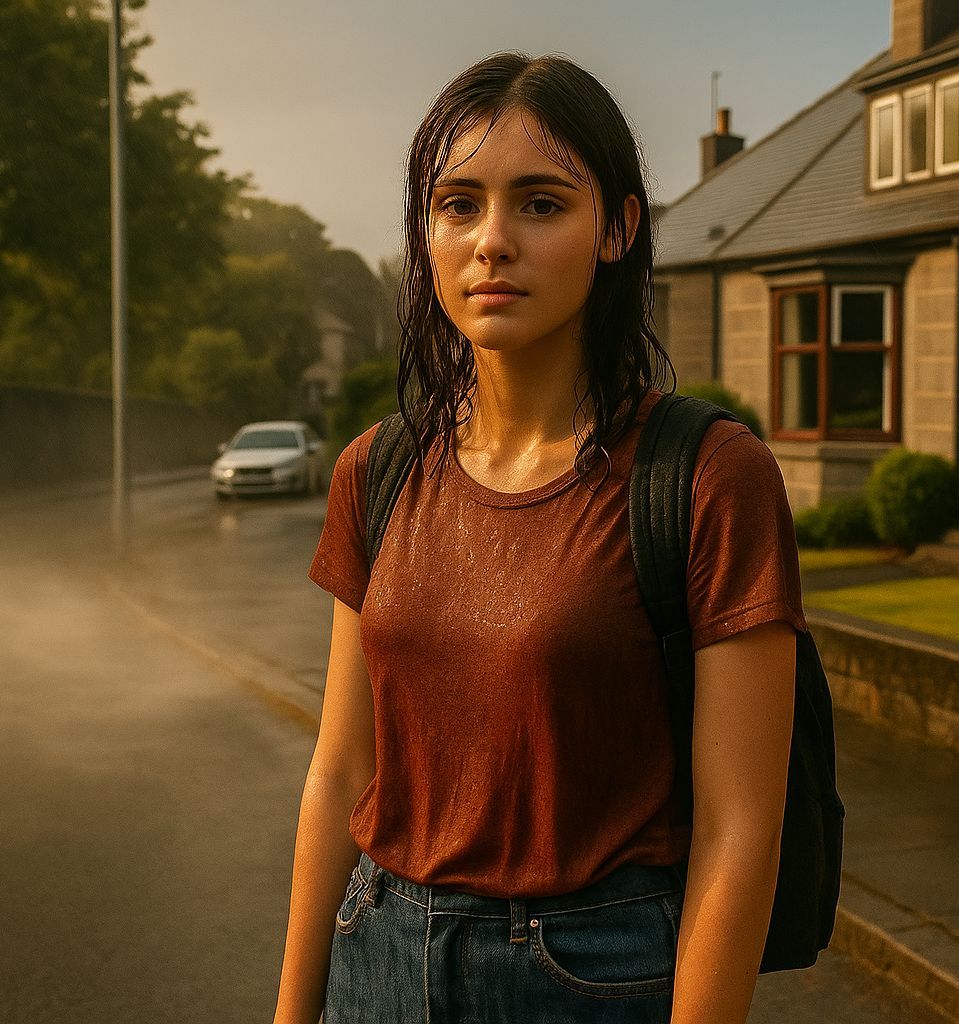 As the mist clears, we begin to see more clearly that Summer is shaking her jacket dry. Collecting her belongings from the ground, and coming closer to the boys with her luggage in hand.